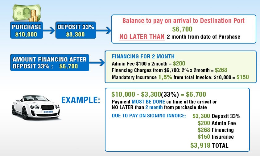 It is very unfortunate if you’ve found yourself a car that satisfies all of your requirements and has an attractive price, but the car is available only for the next couple of days and there is no way you can scrap enough money until then. And it is even more unfortunate if you’ve been looking forward to a bargain and gathering all the needed money only to find that the car you wanted has just been sold to another customer. Auction Export has millions of clients worldwide and auctions pop up and close every day. The sales are fast-paced and there seems to be nothing you can do about it. Except, if you order financing, we can secure the deal for you, buy the vehicle, deliver it to the port, and board it on the ship bound for your country whereas you only have to put a deposit of about 1/3 of the full price. So, why put off and hope for best when you can have it right away?