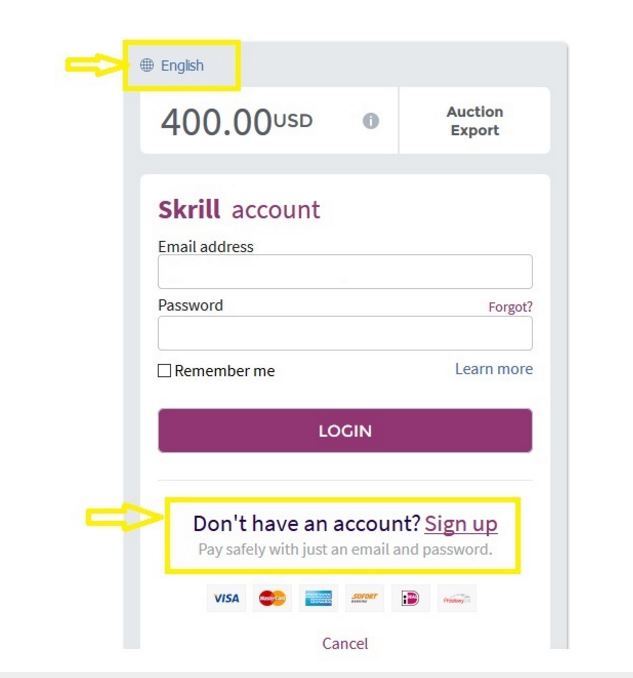 - Выберите Вашу карту или счет Skrill и осуществите платеж.Если у Вас еще нет аккаунта на сайте Skrill, Вы можете создать его непосредственно со своего Кабинета Auction Export (См. Скриншот 2 )