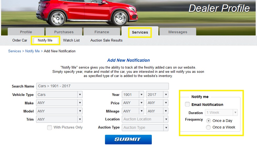 Adjust the parameters of notifications by selecting the needed type, make, model and the year range of your desired vehicle in the left half. Also, you may indicate how often and for how long you would like to receive the updates in the right half of the page. (See Screenshot 1). Direct Link https://www.auctionexport.com/en/Profile/Notifications